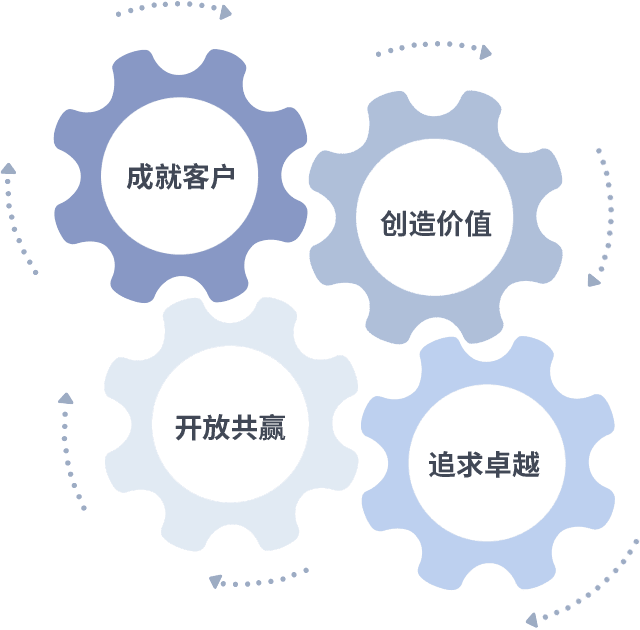 成就客户是一切决策的出发点,,创造价值是衡量所有工作的标准,,追求卓越是我们做事做人的态度,,,,开放共赢是我们的格局也是最终的结果。。。价值观的齿轮环环相扣,,,推动着组织里的每个人不断向前。。。。